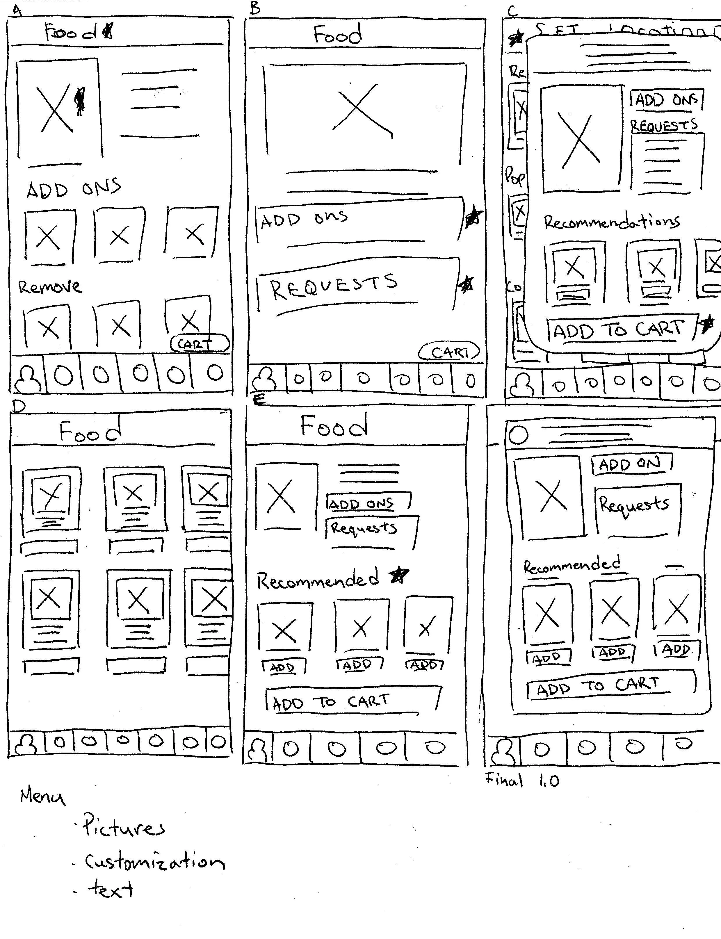 When a menu item is touched, a screen will pop up where the item is displayed with a large image, add on tab, special requests text area, and recommendations. By having the item pop up, the user flow isn’t disrupted by changing screens.